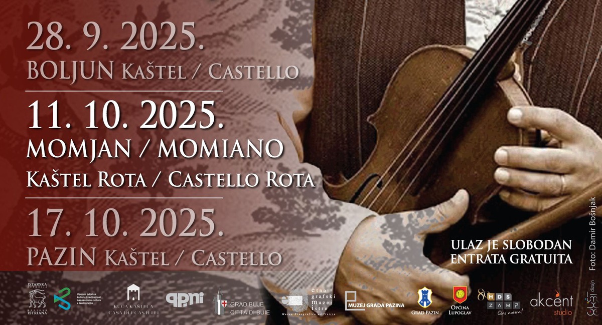 Programma unico che fa rivivere i castelli istriani attraverso la musica dei cantautori ispirati al patrimonio culturale dell’Istria. L’idea della cantautrice Elis Lovrić di creare un festival dedicato ai cantautori solisti è stata riconosciuta dalla Regione Istriana, che lo ha collocato nelle scenografie più suggestive – i castelli medievali. Come naturale prosecuzione del progetto di valorizzazione delle fortezze medievali istriane, è nato così un festival che unisce musica d’autore ed eredità storica, trasformando le mura di pietra in palcoscenici di un patrimonio vivente.